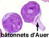 Une anémie normocytaire normochrome est toujours présente. Les plaquettes sont très nettement diminuées. La leucocytose est tantôt < 1x109/l, tantôt > 100x109/l. L'origine myéloïde (ou plus précisément granuleuse) des blastes est affirmée par la présence de granulations azurophiles. La mise en évidence de bâtonnets d'Auer est pathognomonique d'une leucémie aiguë myéloblastique.